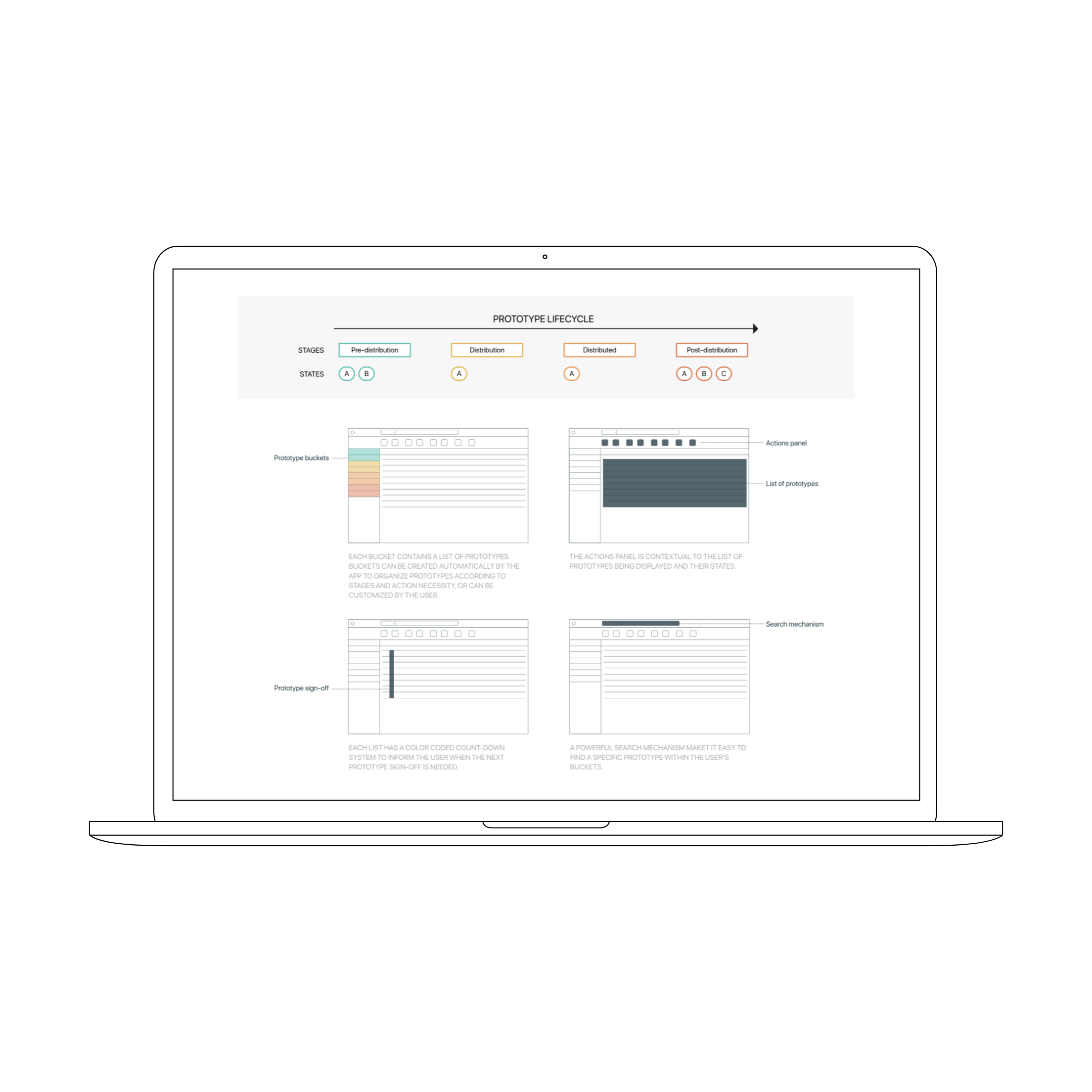The complete redesign of the enterprise app to track the lifecycle of confidential physical prototypes, ensuring a high level of security, following complex business rules, and serving a wide range of stakeholders and users across the organization.